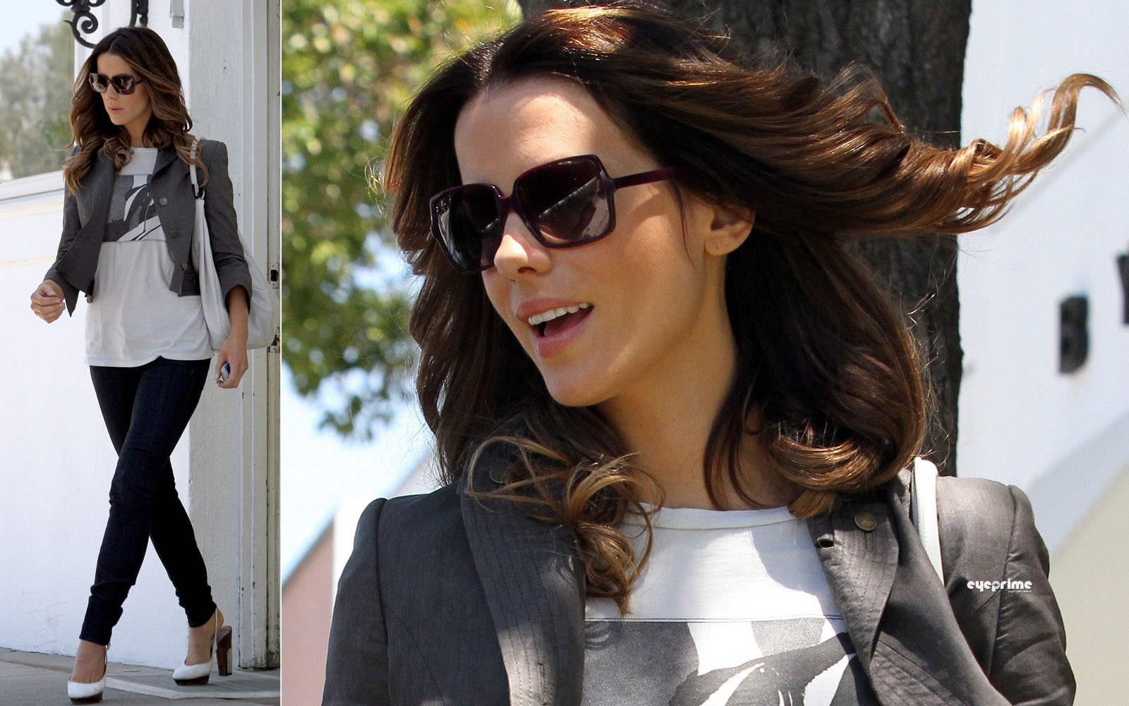 With her hair perfectly parted and her layered locks in check, actress Actress Kate Beckinsale flashes a little smile to photographers as hubby Len Wiseman wisps her away from a salon in Beverly Hills, Ca on May 1, 2010. Len must not want to share his lovely pampered prize Kate today!