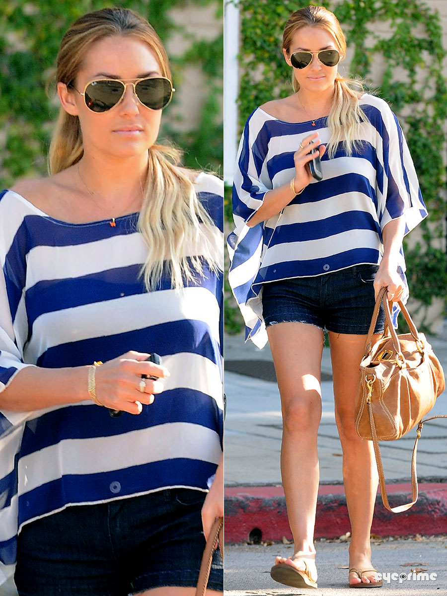 Lauren Conrad wears a blue and white striped top, jean shorts and carries a Miu Miu handbag as she leaves Kate Somerville skin care in West Hollywood. Conrad looks a bit more put together than yesterday's trip to the skin care experts as she Tweeted her embarrassment, "Gym clothes, no makeup, wet hair and leaving a painful laser hair removal apt... This is exactly when I want to find 15 paps around my car.